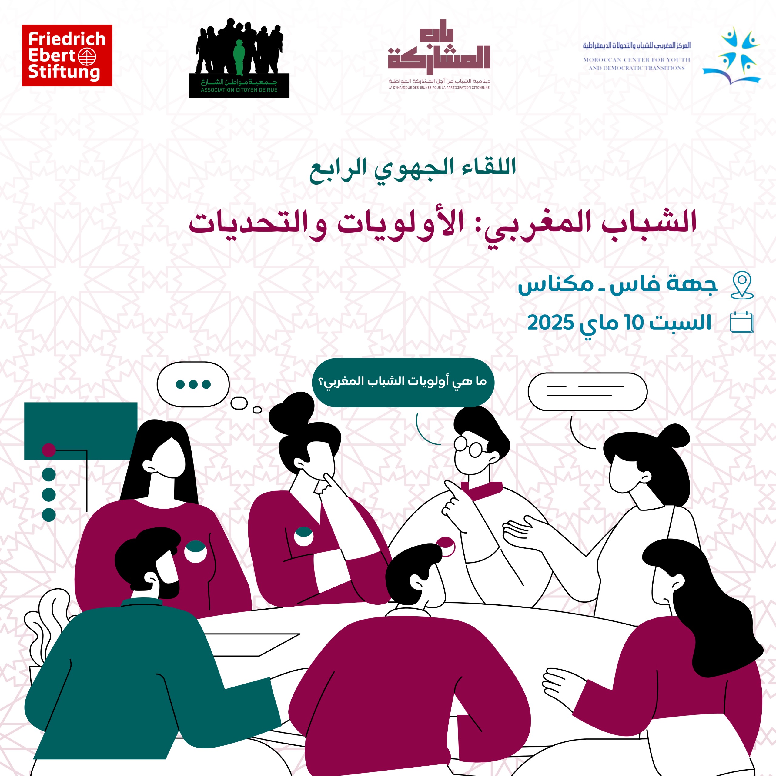 Fès – Le Centre Marocain pour la Jeunesse et les Transformations Démocratiques a organisé, le samedi 10 mai 2025, la quatrième rencontre régionale dans la région de Fès-Meknès, sous le thème : "La jeunesse marocaine : priorités et défis". Cet événement a été organisé en partenariat avec l’association « Citoyen de la rue » et avec le soutien de la Fondation allemande Friedrich Ebert – Bureau du Maroc. La rencontre, qui s’inscrit dans le cadre du projet *« Dynamique jeunesse pour la participation citoyenne », vise à encourager l’implication des jeunes dans la vie publique et à offrir un espace ouvert de discussion autour des enjeux actuels les concernant, dans une démarche participative fondée sur les principes de la démocratie et des droits humains.
